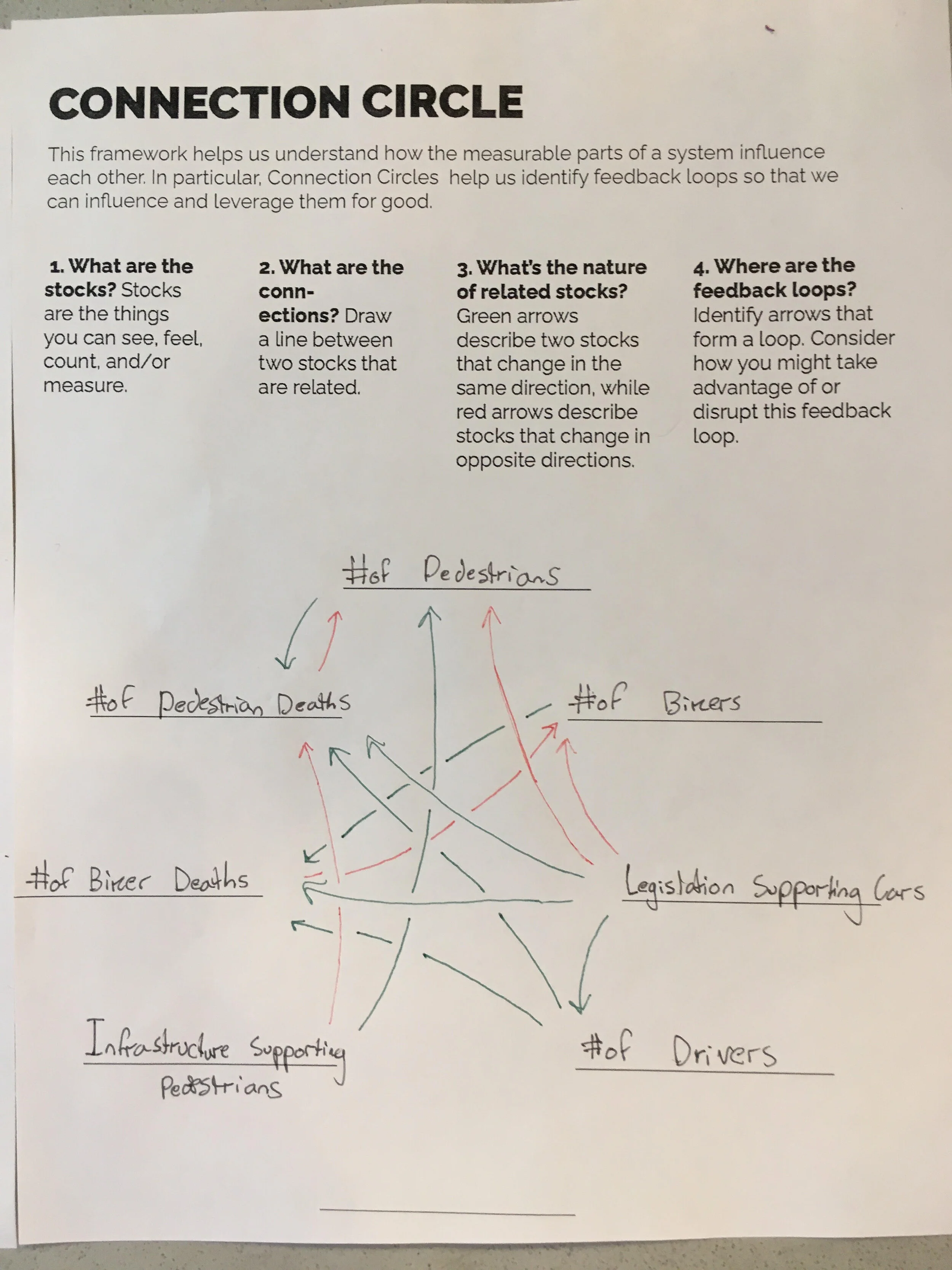 In the morning, we jumped into Connection Circles. Connection Circles help us understand cause and effect relationships between the stocks of an issue (the things we can measure, count, see).
